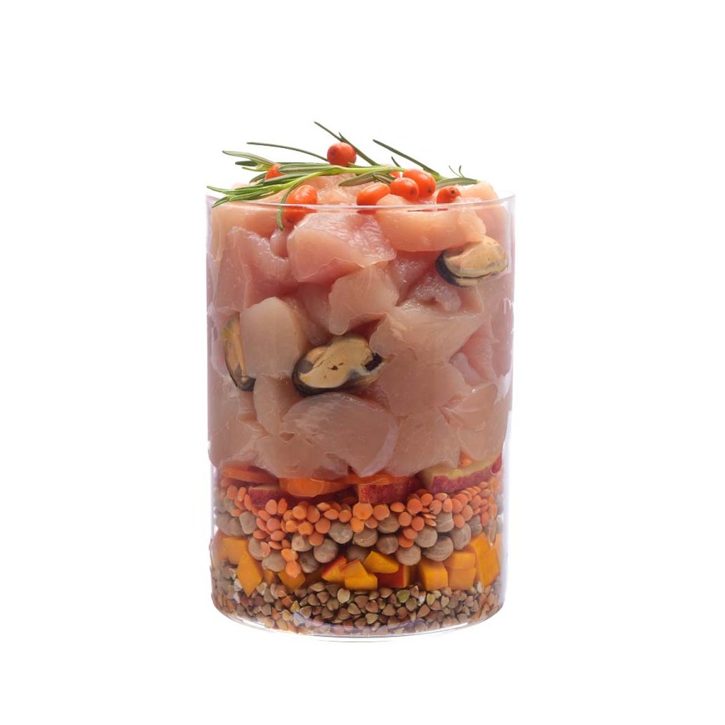 Čerstvé kuře 60 %, pohanka 14 %, sušená jablka, lignocelulóza, červená čočka 4 %, cizrna, dýně, lososový olej 2 %, přírodní aromata, kuřecí tuk (konzervováno tokoferoly), mrkev, semena a slupky psyllia 0,5 %, protein z okřehku 0,5 %, sušené vaječné skořápky 0,4 %, spirulina 0,3 %, sušený rakytník řešetlákový 0,2 %, sušený kořen zázvoru 0,1 %, sušené borůvky 0,1 %, sušený rozmarýn 0,1 %, sušené brusinky 0,1 %, sušený tymián 0,1 %, glukosamin 0,03 %, slávka zelenoústá 0,025 %, chondroitin sulfát 0,023 %, pivovarské kvasnice (zdroj mannan-oligosacharidů) 0,017 %, kořen čekanky (zdroj frukto-oligosacharidů) 0,015 %, juka schidigera 0,011 %.