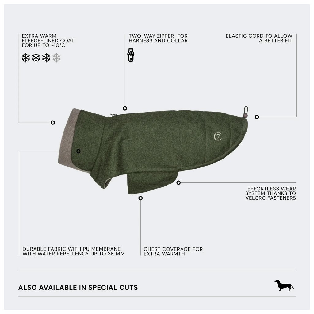 Díky jednoduchému zapínání na suchý zip je nasazení nebo sundání kabátu hračka. Kabát Brooklyn Flannel je vyhotoven z vysoce voděodolné látky a podšitý hřejivým fleesem. Délku oblečku lze přizpůsobit pomocí gumičky. Kabát obsahuje otvor pro připnutí postroje. Lze prát v pračce.