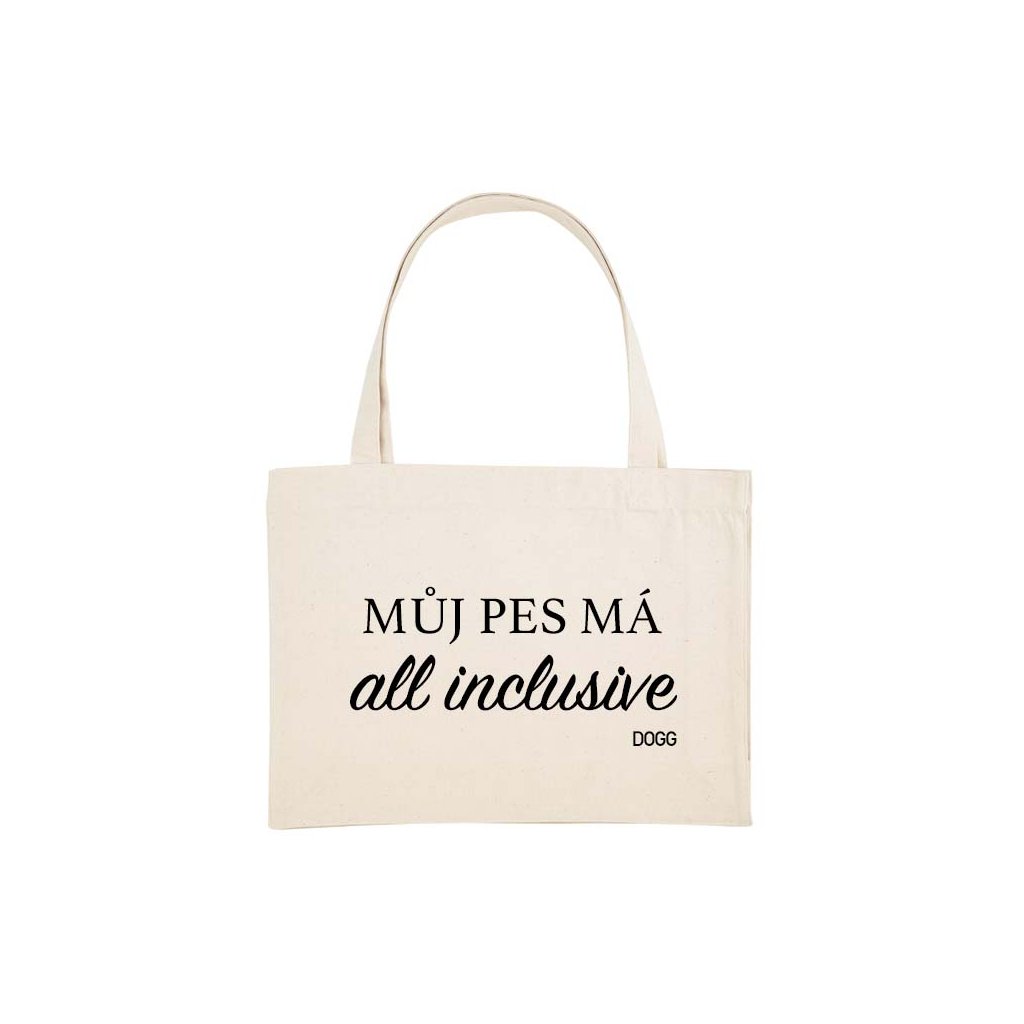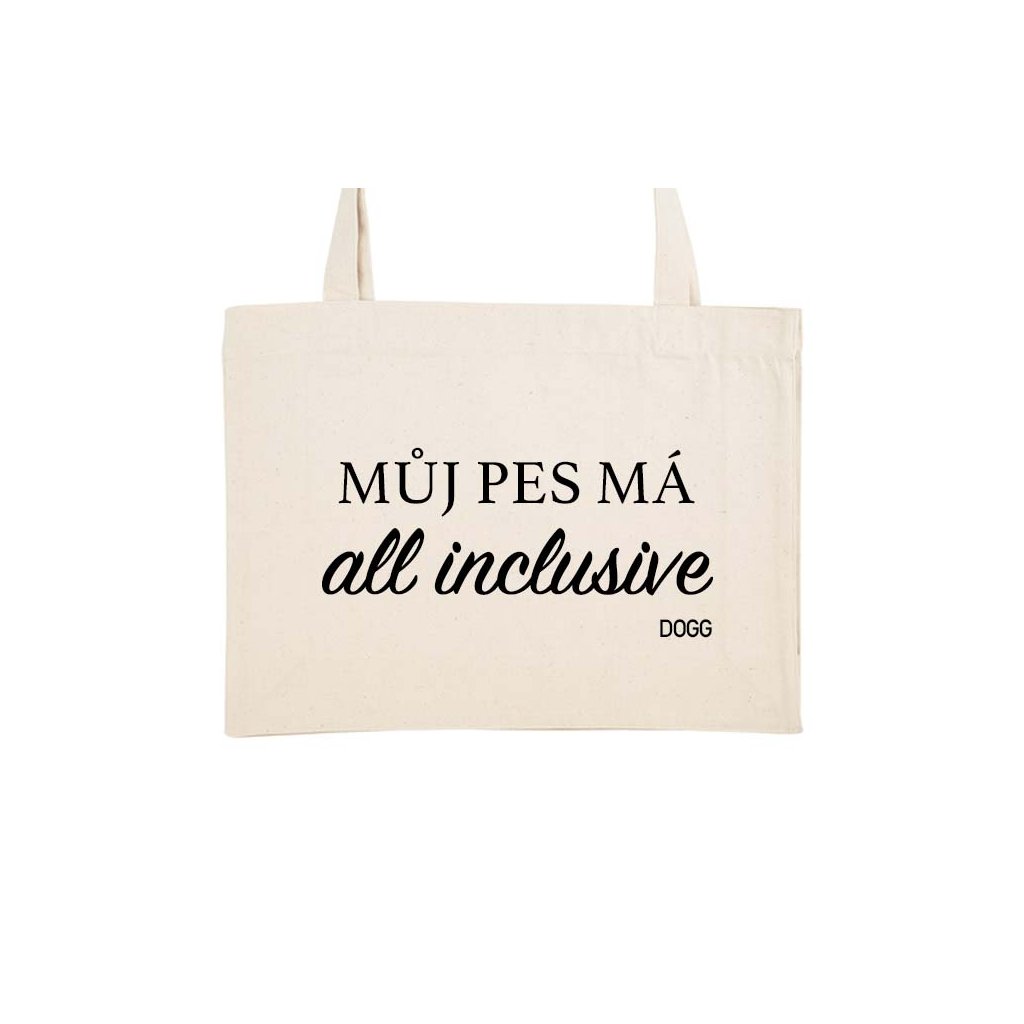 Taška z recyklovaných materiálů Můj pes má all inclusive se bude hodit pro tvé pravidelné nákupy. Je lehká a skladná. Tašku lze prát v pračce.