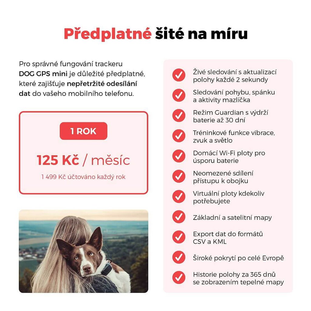Při aktivaci lokátoru DOG GPS mini budete přesměrování na platbu ročního předplatného za 1499,- Kč vč. DPH, které zajišťuje nepřetržité odesílání dat o každé poloze vašeho mazlíčka do aplikace Pet Tracker ve vašem mobilním telefonu. Při zakoupení předplatného v App Store se cena může lišit, neboť je řízena pravidly společnosti Apple.
