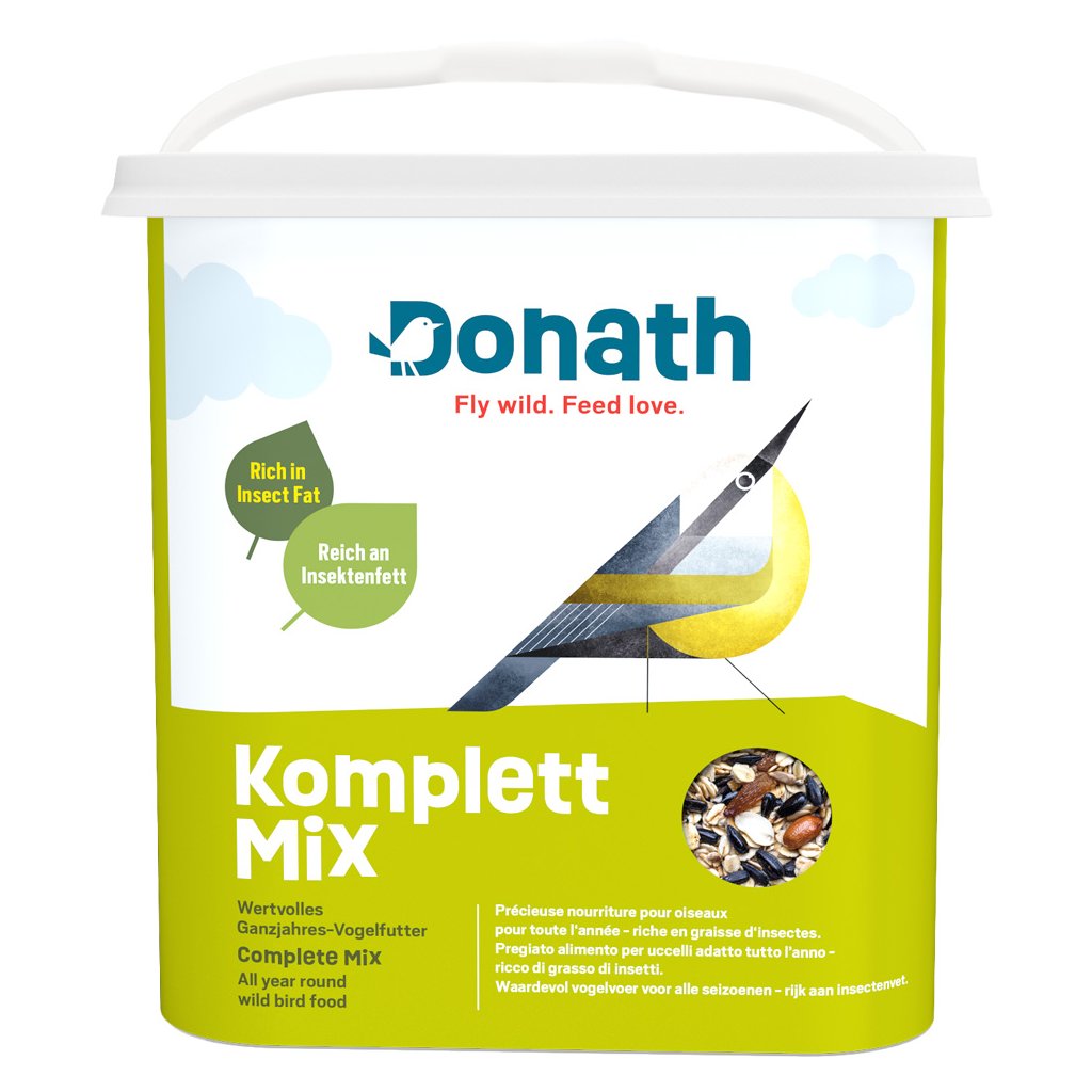 Complete Mix od značky Donath obsahuje na živiny bohaté složení včetně ovesných vloček, slunečnicových semínek, hrozinek, konopných semínek, arašídů, minerálů a hmyzího tuku, který se získává z přibližně 3 000 kusů hmyzu na kilogram. Pestrá krmná směs zajišťuje ptákům přísun všech důležitých živin, které potřebují pro své zdraví a vitalitu.