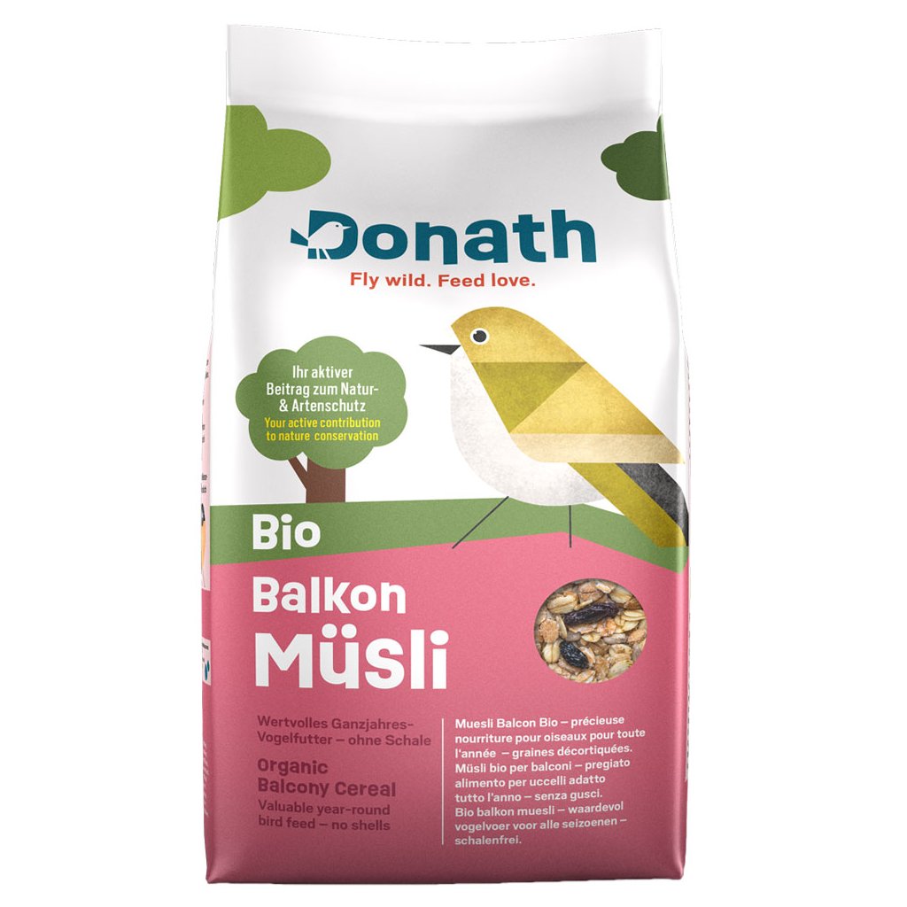 Balkon Müslije organická směs od značky Donath, díky níž se každý divoký pták stane stálým hostem ve vašem krmítku. Bez slupek pro čistý balkon.