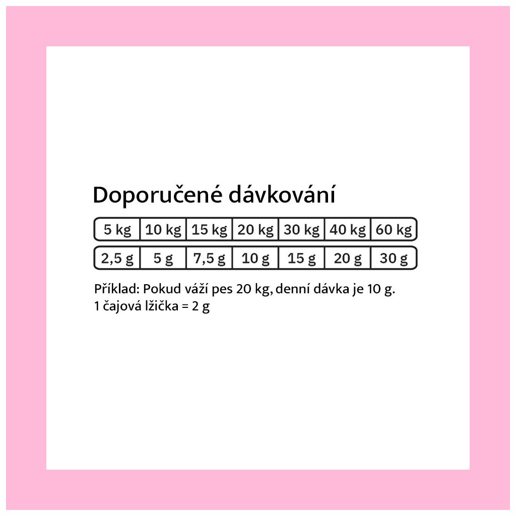 Nasypte prášek do krmiva vašeho psa podle tabulky dávkování (viz obrázky). Díky přirozené chuti borůvek a hmyzu je neodolatelný i pro vybíravé psy.