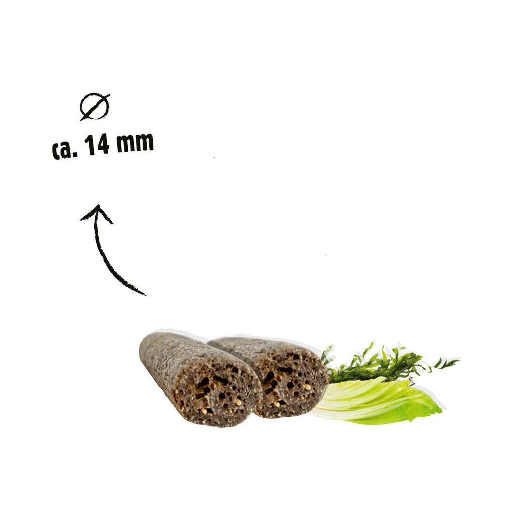 Brambory* 38,9 %, rostlinný glycerin, bramborový škrob 20 %, celulóza 6,5 %, hmyz (Hermetia illucens* a Hermetia illucens olej) 5,5 %, mořské řasy* (Ascophyllum nodosum) 2,5 %, čekanka* jako zdroj inulinu 0,5 %, hydrogenuhličitan sodný. *sušené. Doplňkové látky na kg: Aromata (Eucalyptus globulus, eukalyptový olej 500 mg), zeolit 4000 mg/kg.