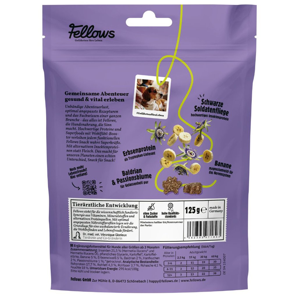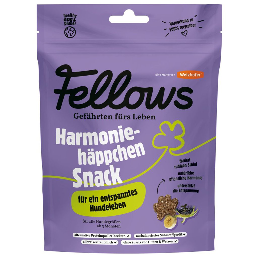 S harmonickými pochoutkami Fellows můžete svému psovi dopřát chvilky klidu a odpočinku. Ať už po vzrušujícím dni plném dobrodružství, nebo jako odměna před spaním - tyto chutné kousky jsou ideální pro odreagování. Jemná kombinace uklidňujících rostlin a sladkého a na hořčík bohatého banánu poskytuje příjemný pocit, který napomůže vašemu čtyřnohému příteli k relaxaci.