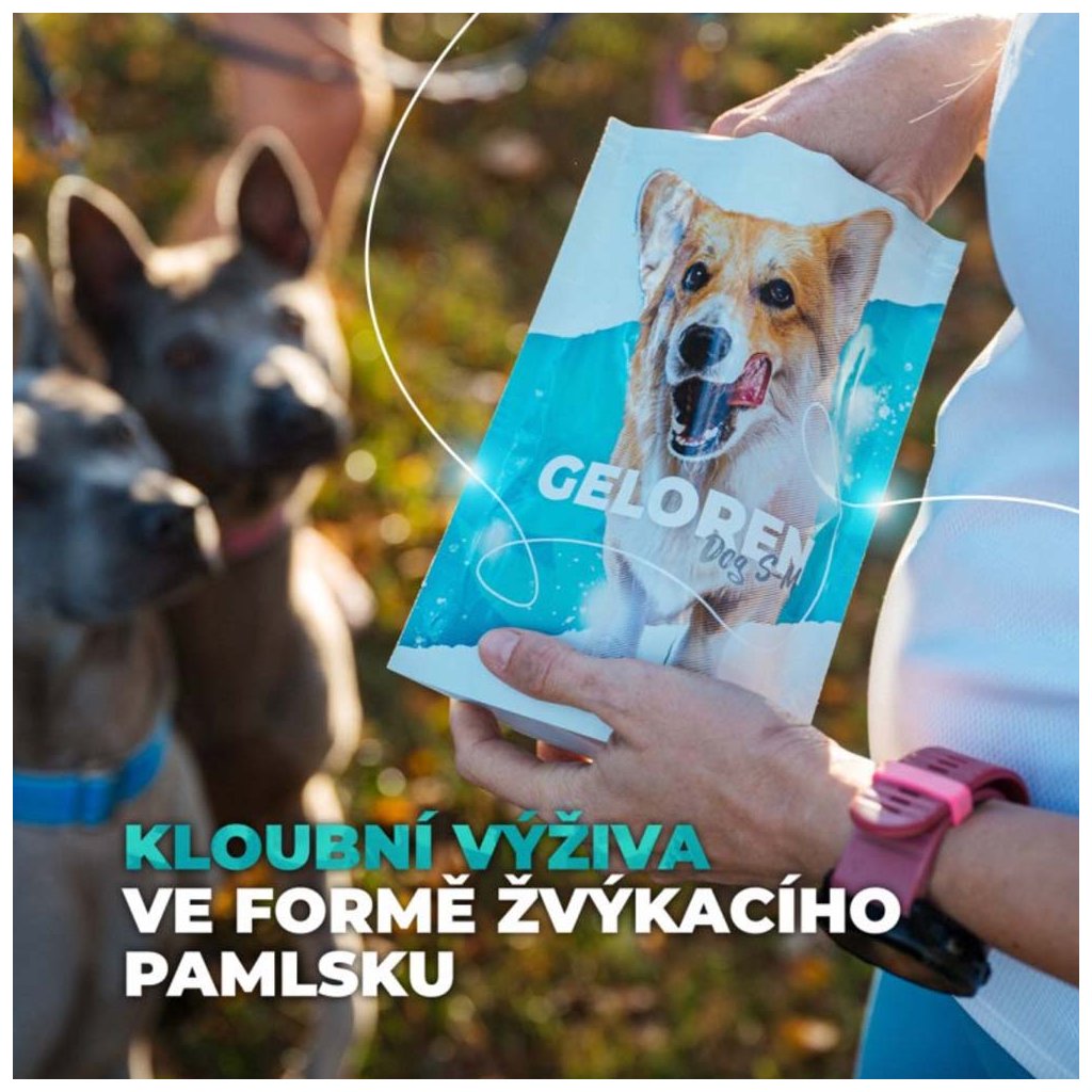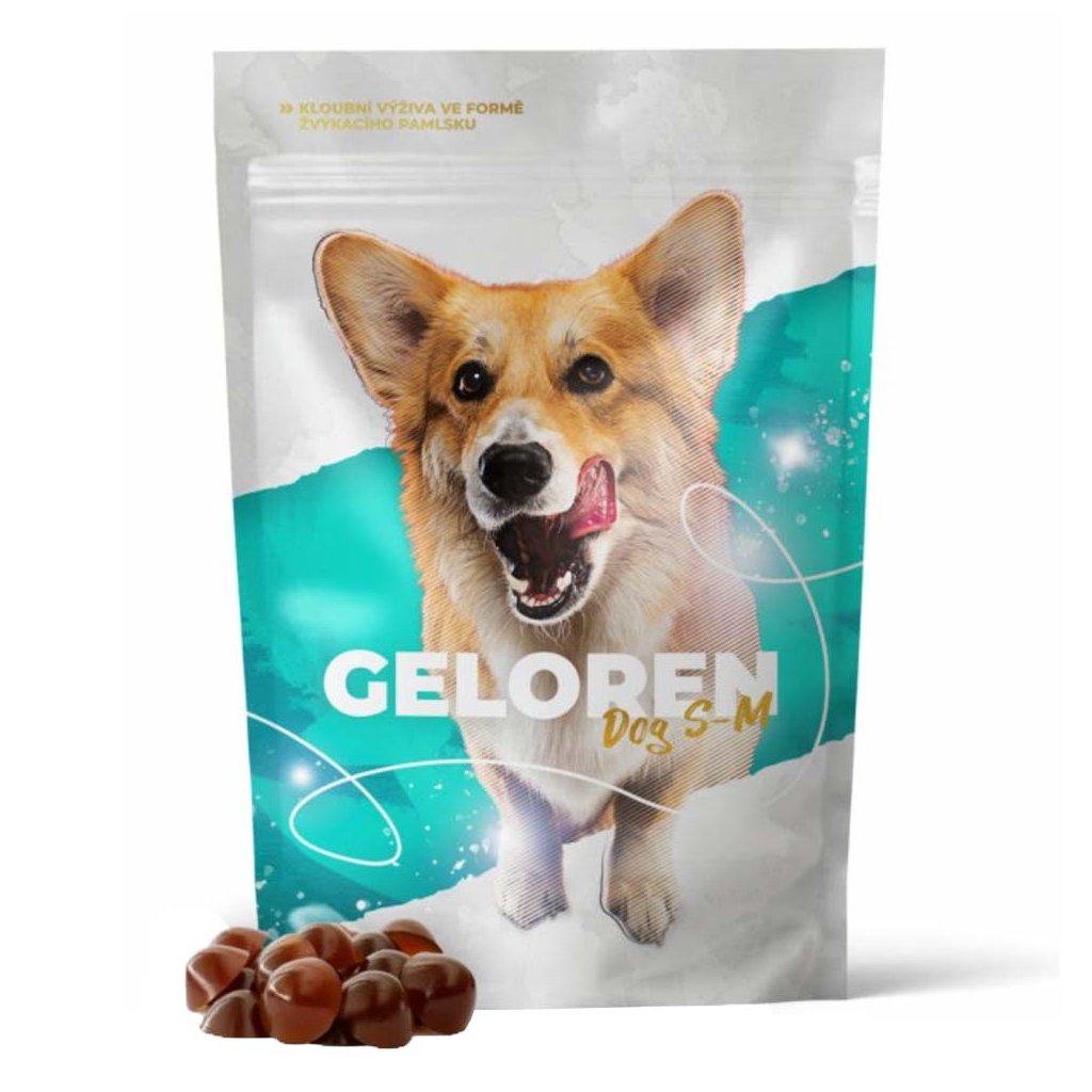 Výživa pro klouby a šlachy psů. Určeno pro psy s vysokou fyzickou námahou, menší plemena psů a pro starší psy. Vyrobeno v České republice. Získané z přírody - obsahuje tělu přirozené látky vyráběné biotechnologicky. Obsahuje 60 tablet.Geloren Dog S-M ve formě ochucených žvýkacích kostek je určený pro malá a střední plemena psů. Napomáhá regeneraci kloubů u řady pohybových problémů. Slouží také jako prevence pro prodloužení aktivního života psa. Nově s játrovou příchutí, která psům chutná jako nikdy předtím.