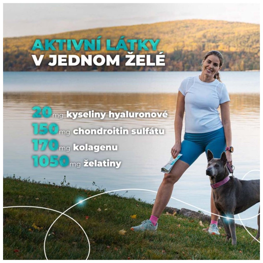 Voda, želatina (vepřová) 35,0 %, hydrolyzovaný kolagen (vepřový) 5,9 %, chondroitin sulfát 5,4 %, glycerin, zchutňující látka (játrová příchuť), sorban draselný, kyselina hyaluronová 0,7 %, povrchová úprava želé kostek proti slepování (kokosový olej, řepkový olej a karnaubský vosk).