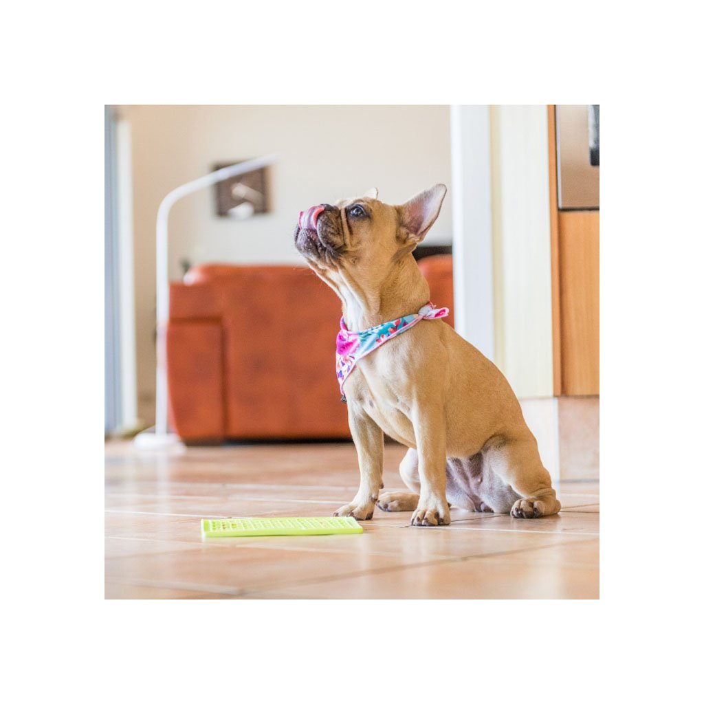 Lízací podložka LickiMat umožňuje rozložit menší množství krmiva a vychutnat si ho po mnohem delší dobu. Skvěle se tak hodí pro psy s tendencí k hltání, krkání a nadýmání. Doporučuje také při redukčních dietách. Většinu pamlsků lze zmrazit, čímž dobu pro jejich snězení ještě prodloužíte. Pro dobré zapracování jídla do formy doporučujeme použít stěrku.