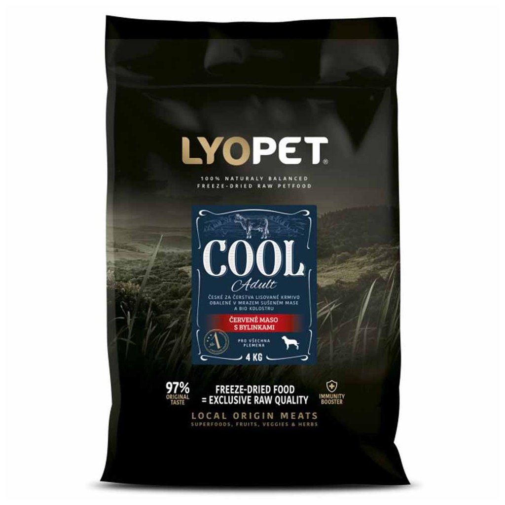 Lyopet Cool je kompletní superprémiové krmivo pro psy středních a velkých plemen. Obsahuje granule z červeného masa, šetrně lisované za studena a obalené v mase sušeném mrazem. Kvalitní granule pro psy s vysokým obsahem masa.