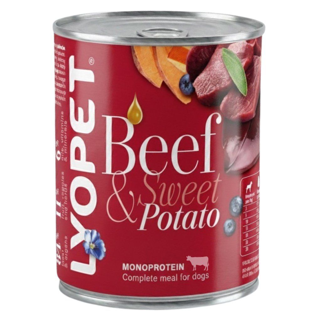 Prémiová konzerva Lyopet Beef & Sweet Potato přináší do psí misky poctivou porci masa v kombinaci s funkčními přírodními surovinami. Obsahuje 80 % hovězího masa, které je bohaté na kvalitní bílkoviny, železo a zinek pro podporu svalů, imunity a celkové vitality. Díky monoproteinové receptuře je skvělou volbou i pro psy s citlivějším trávením nebo potravinovými intolerancemi.