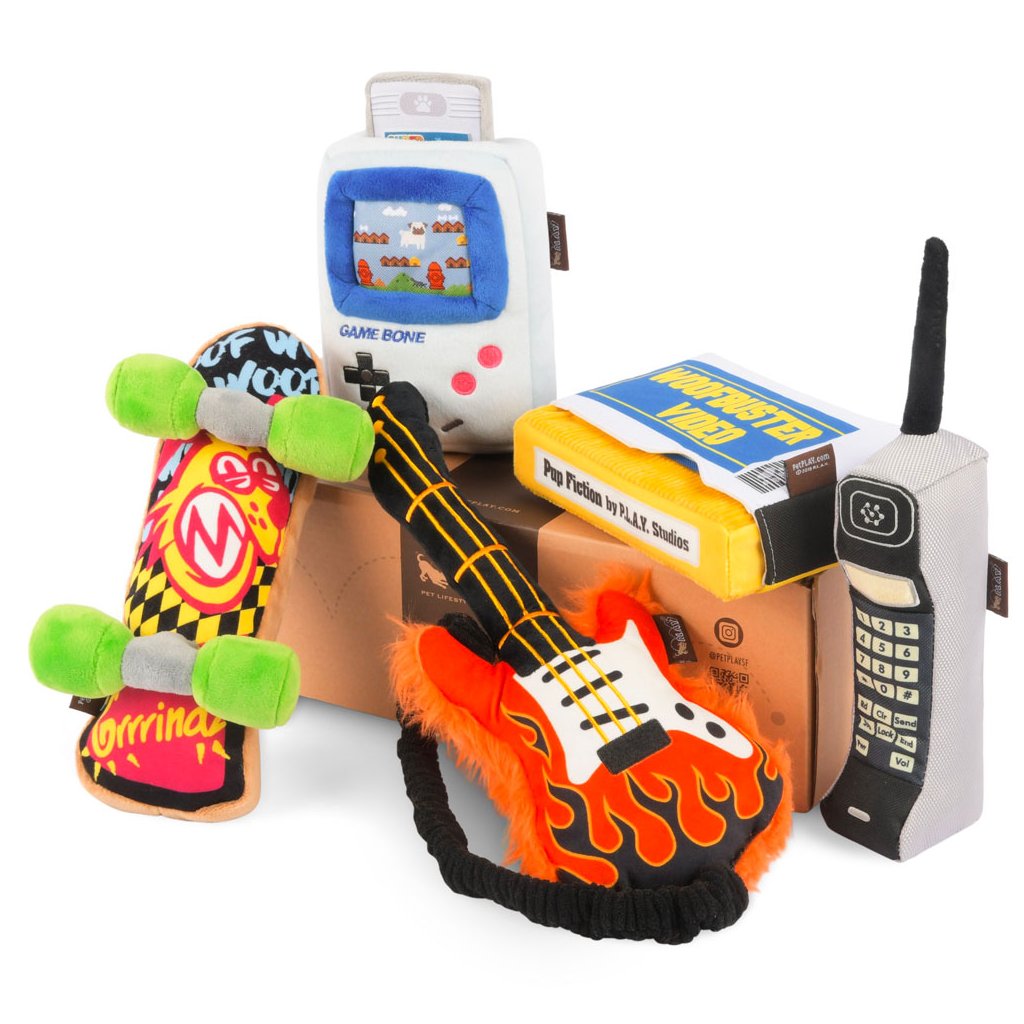 Hračka pro psy. Vyrobeno z recyklovaných materiálů.Zpátky do minulosti! Po tom, co značka P.L.A.Y. připravila kolekci hraček pro psy inspirovanou 80. léty, přichází na řadu devadesátky. Nová retro kolekce 90s Classics obsahuje Skateboard, Elektrickou kytaru, Game Boy a Videokazetu. Je vám to pořád málo? Zvolte Dárkový set 90s Classics, ve kterém navíc najdete taky Mobil.