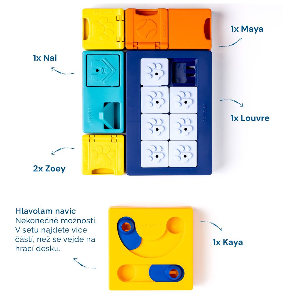 Pawzler Smarty Set obsahuje hlavolamy úrovně 2 a 3, které přináší náročnější výzvu pro vašeho psa. Tato sada prodlouží herní čas a promění ho ve vzrušující mentální cvičení, které podnítí zvědavost psa. Pes musí pohnout posuvníky různými směry, otevírat víčka a objevit tajné schránky, aby se dostal k vytouženému pamlsku,