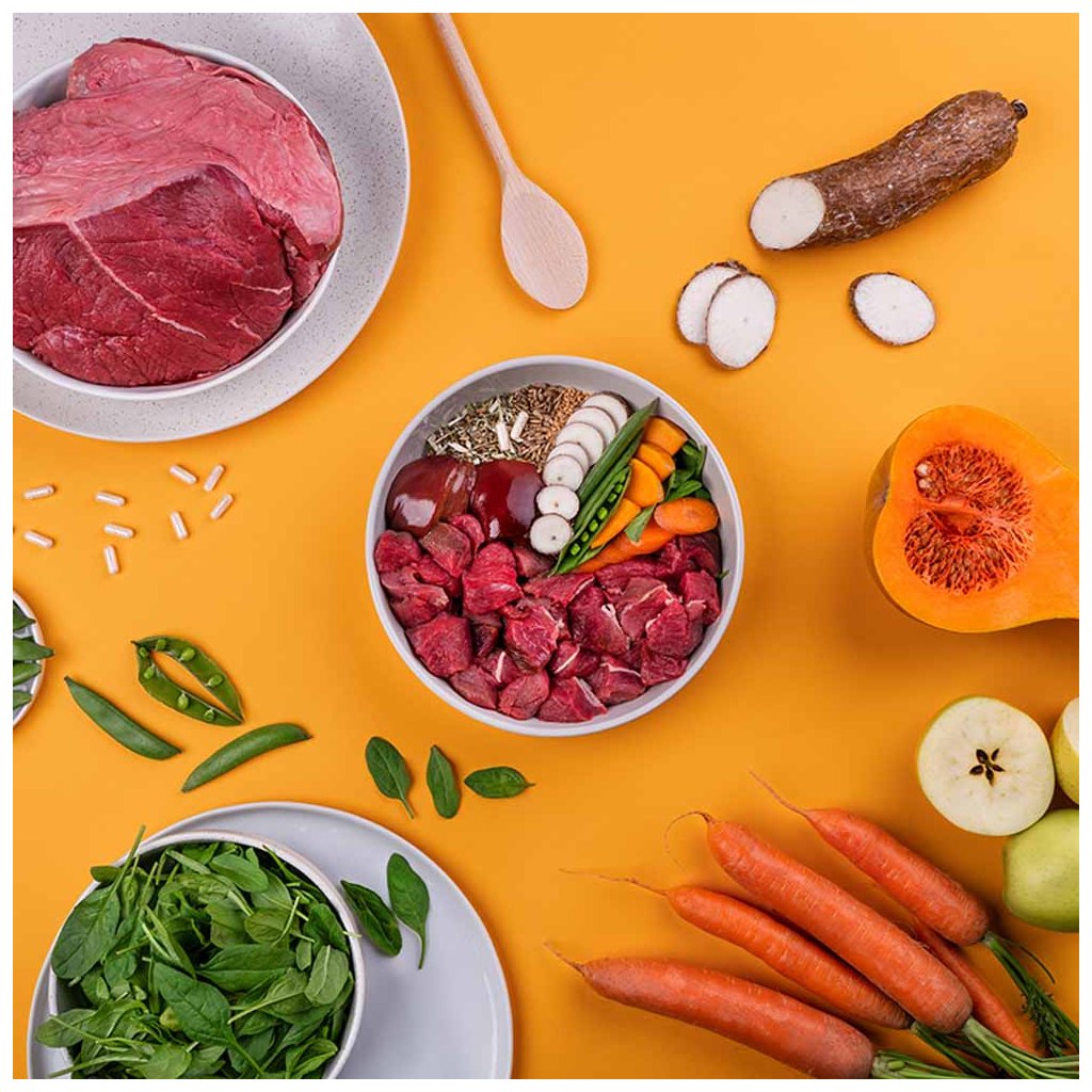 Čerstvé hovězí 50 %, sušené hovězí 16 %, hrách 16 %, hovězí tuk 5 %, dýně 2 %, sušená jablečná dužina 2 %, játrový vývar 2 %, lososový olej 2 %, lněné semínko 2 %, sušené vaječné skořápky 1 %, hrachová mouka, sušený špenát 0,5 %, mrkev 0,5 %, sušený srdečník 0,1 %, glukosamin 0,026 %, chondroitin sulfát 0,016 %, frukto-oligosacharidy 0,02 %, mannan-oligosacharidy 0,015 %, Mojave yucca 0,01 %, semena ostropestřce mariánského 0,008 %, probiotika Lactobacillus helveticus HA – 122 inaktivováno 15x109 buněk/kg.