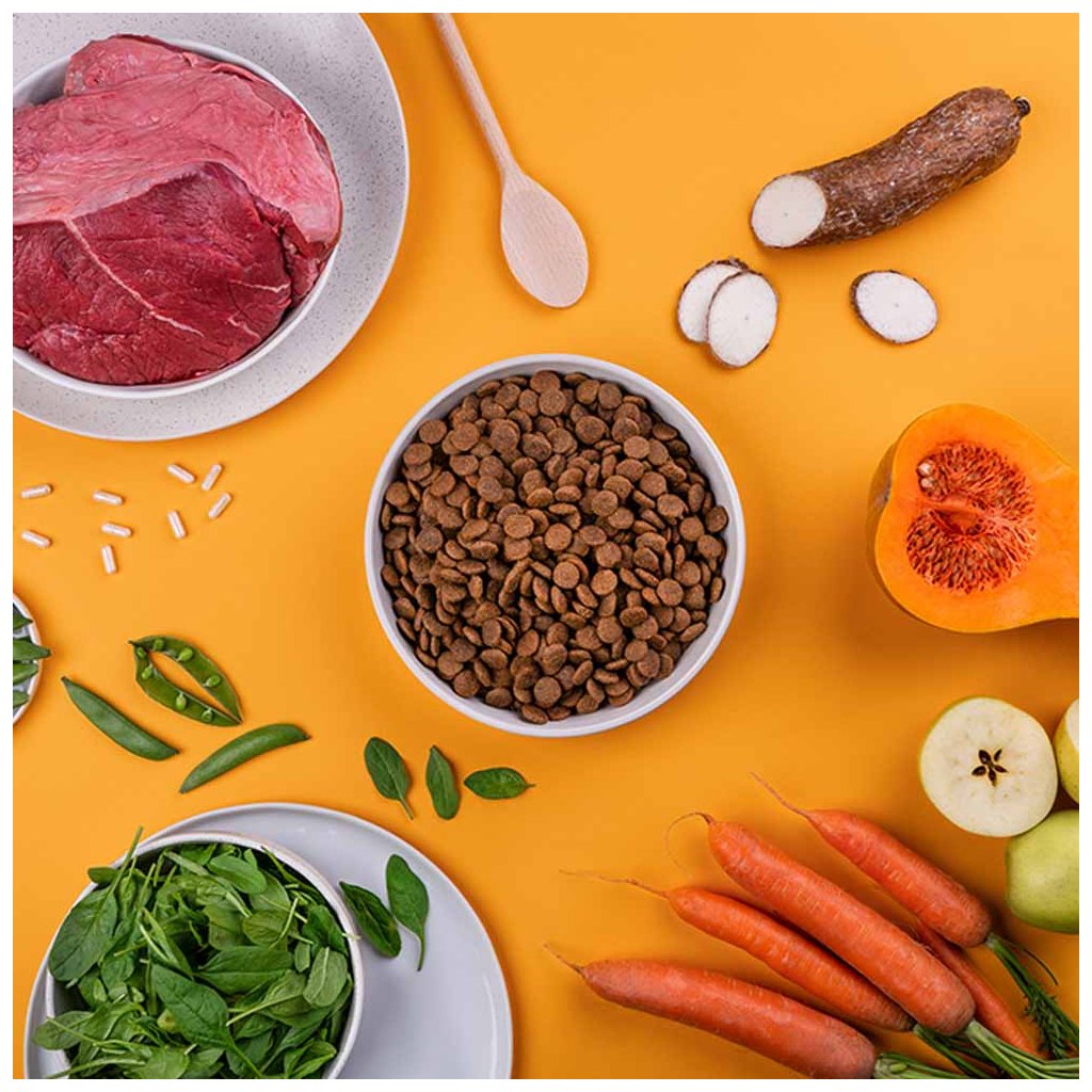 V tomhle receptu jsme mysleli na psy, kteří milují hovězí. Základem je čerstvé hovězí maso, ke kterému jsme nastrouhali dýni, mrkev a nasekali špenát. Všechno jsme uvařili šetrně na páře a přidali prospěšná probiotika. Obloukem jsme se přitom vyhnuli chemii, obilovinám a jiným levným plnidlům.