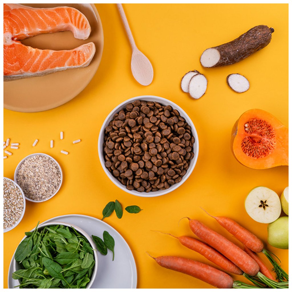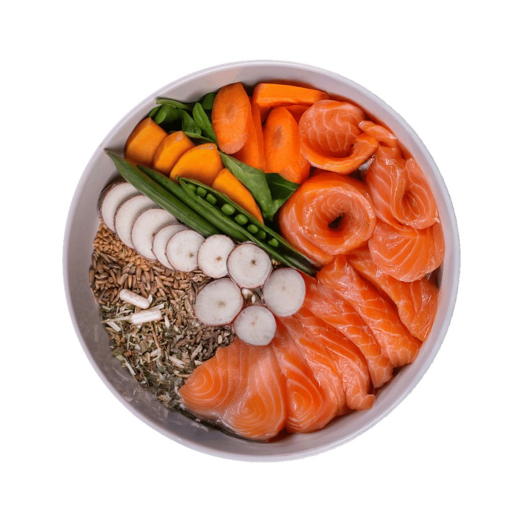 Čerstvý losos 50 %, sušený losos 19 %, hrách 11 %, vepřový tuk 6 %, vývar 3 %, dýně 2 %, sušená jablečná dužina 2 %, lososový olej 2 %, lněné semínko 2 %, sušené vaječné skořápky 1 %, hrachová mouka, sušený špenát 0,5 %, mrkev 0,5 %, sušený srdečník 0,1 %, glukosamin 0,03 %, frukto-oligosacharidy 0,022 %, chondroitin sulfát 0,02 %, mannan-oligosacharidy 0,018 %, Mojave yucca 0,012 %, semena ostropestřce mariánského 0,009 %, probiotika Lactobacillus helveticus HA – 122 inaktivováno (15x10⁹ buněk/kg).