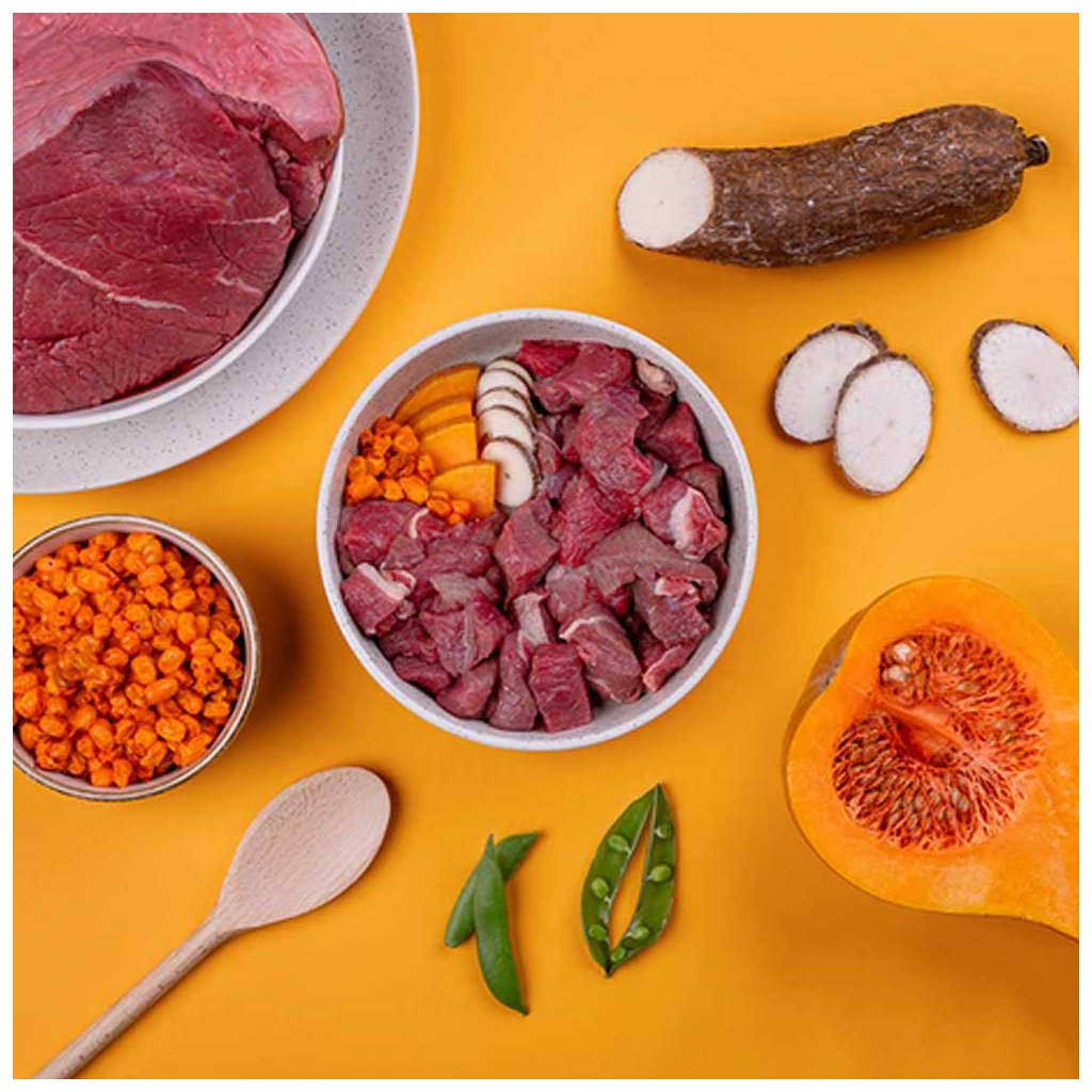Čerstvé hovězí maso 60 %, vývar z masa a kostí 30,63 %, dýně 4 %, hrách 2 %, hrachová mouka 2 %, lignocelulóza 1 %, uhličitan vápenatý 0,3 %, sušený rakytník 0,05 %, sušené řasy 0,01 %, Ascophyllum nodosum, sušenná Yucca schidigera 0,01 %.