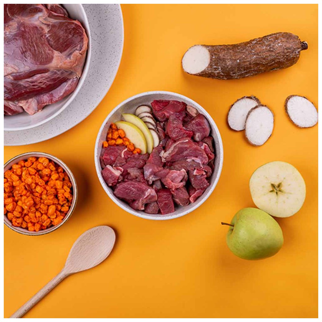 U této konzervy jsme mysleli hlavně na psy s citlivým zažíváním a alergiemi. Sáhli jsme proto po dobře stravitelném jehněčím mase, nastrouhali jablko a přidali yuccu s rakytníkem. Ingredience jsme zalili silným jehněčím vývarem a pomalu povařili. Obloukem jsme se přitom vyhnuli obilovinám a jiným levným plnidlům.