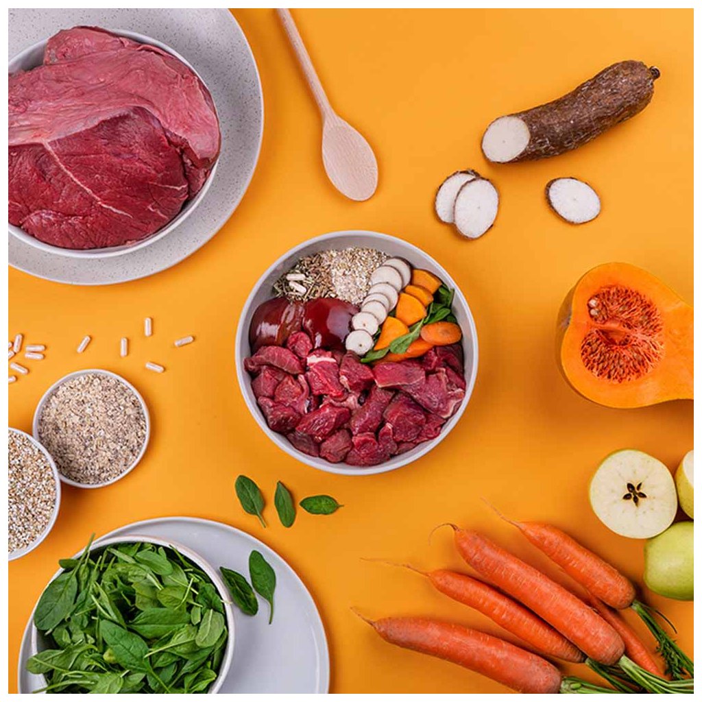 Čerstvé hovězí 35 %, sušené hovězí 20 %, ovesné vločky 12 %, sušená jablečná dužina 8 %, hovězí tuk 7 %, dýně 5 %, pohanka 5 %, játrový vývar 2 %, pivovarské kvasnice 2 %, lososový olej 1 %, mrkev 1 %, sušený špenát 1 %, hrachová mouka, sušený srdečník 0,1 %, glukosamin 0,022 %, chondroitin sulfát 0,015 %, frukto-oligosacharidy 0,02 %, mannan-oligosacharidy 0,015 %, Mojave yucca 0,01 %, probiotika Lactobacillus helveticus HA – 122 inaktivováno 15x109 buněk/kg, semena ostropestřce mariánského 0,005 %.