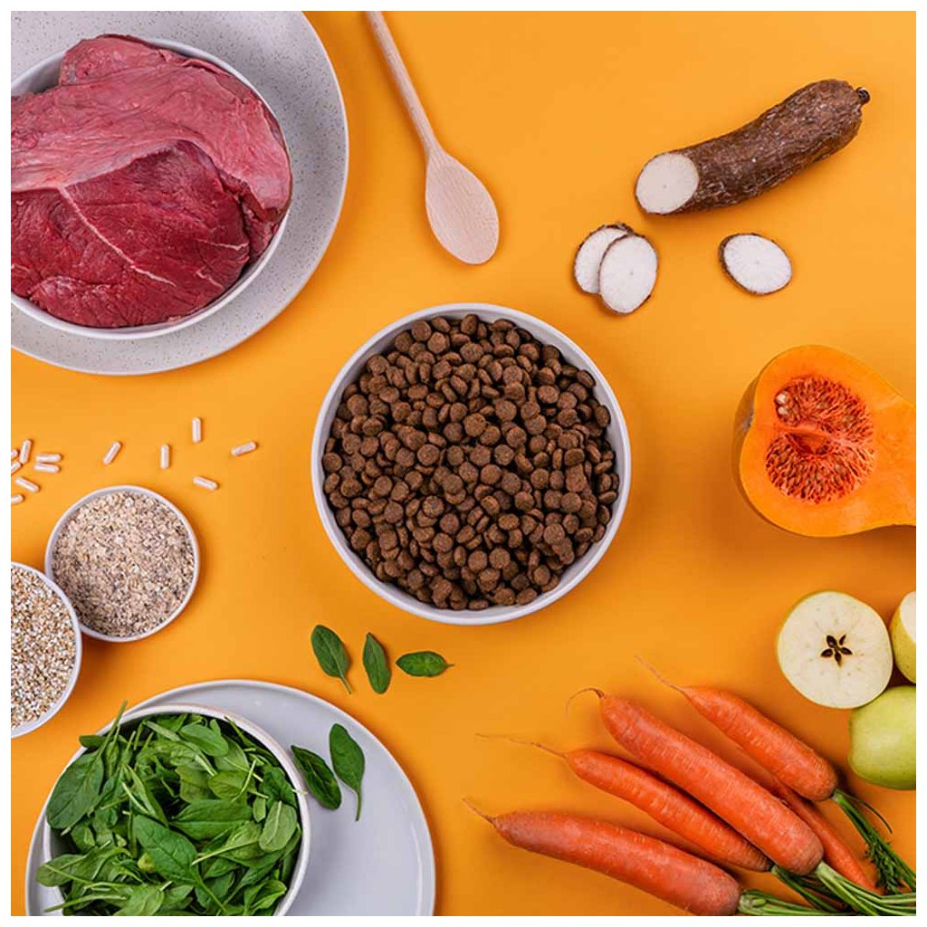 V tomhle receptu jsme mysleli na psy, kteří milují hovězí. Základem je čerstvé hovězí maso, ke kterému jsme nastrouhali dýni s mrkví, nasekali špenát a přidali zdravou pohanku a ovesné vločky. Všechno jsme uvařili šetrně na páře a doplnili o prospěšná probiotika. Obloukem jsme se přitom vyhnuli lepku, kukuřici a jiným levným plnidlům.