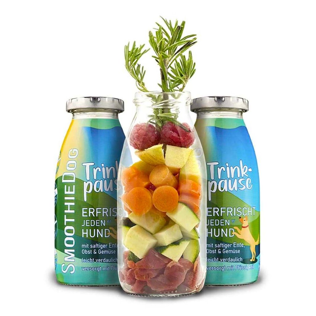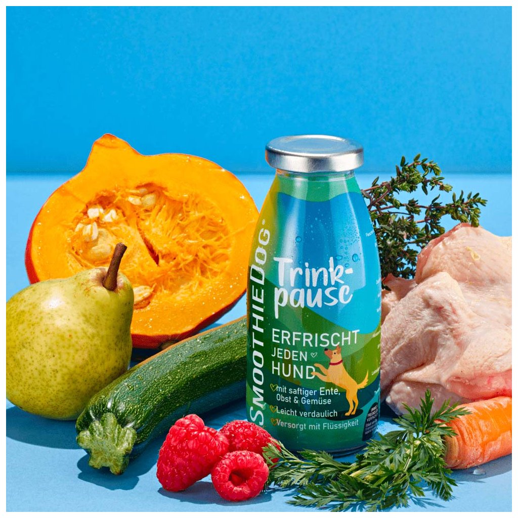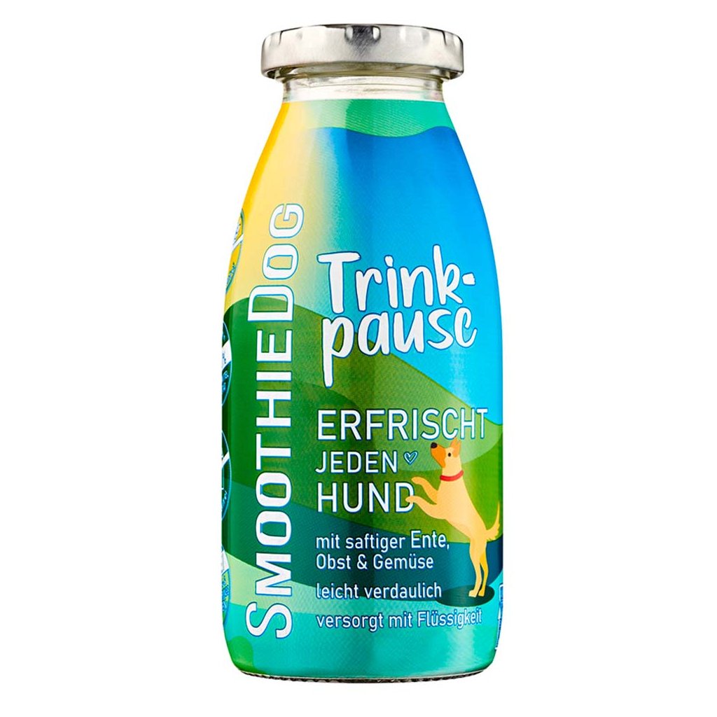 Potřebujete psa přimět dodržovat pitný režim? Vyzkoušejte smoothie od SmoothieDog s výstižným názvem Přestávka na pití. Neodolatelný drink z kachní svaloviny je zárukou přísunu tekutin pro roztržitá štěňátka i unavené psí seniory. Přibalte SmoothieDog do auta nebo do batohu na výlet v jakémkoliv ročním období. Váš pes načerpá energii a doplní tekutiny tím nejlahodnějším způsobem.