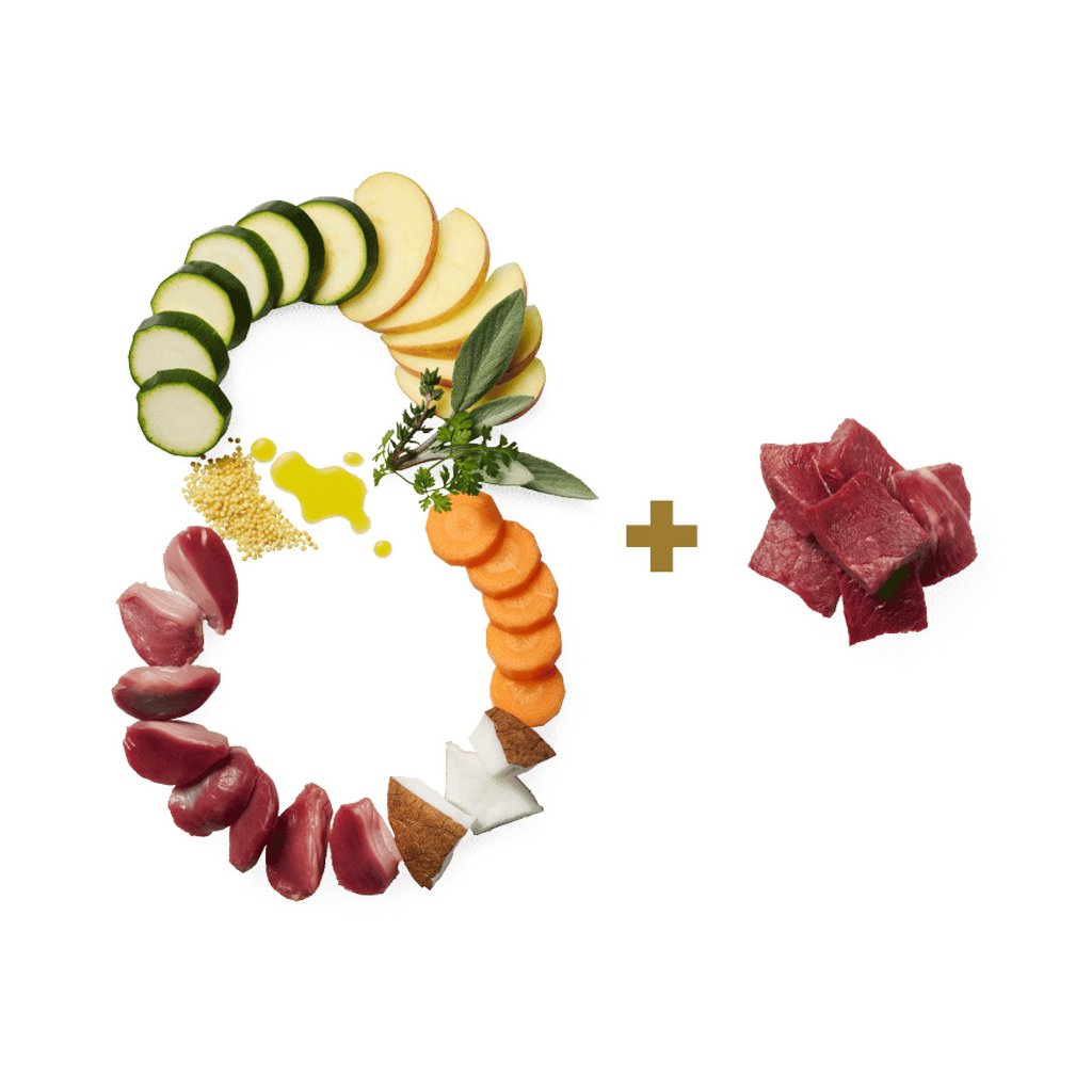 Po mase následuje dalších šest báječných surovin. Kromě energeticky bohatých jáhel je zastoupena zelenina z okolních zahrad a sadů. Křupavá mrkev, jemná cuketa a na vitamíny bohatá jablka poskytují přirozené živiny, které psovi nejen chutnají, ale také podporují jeho imunitní systém.