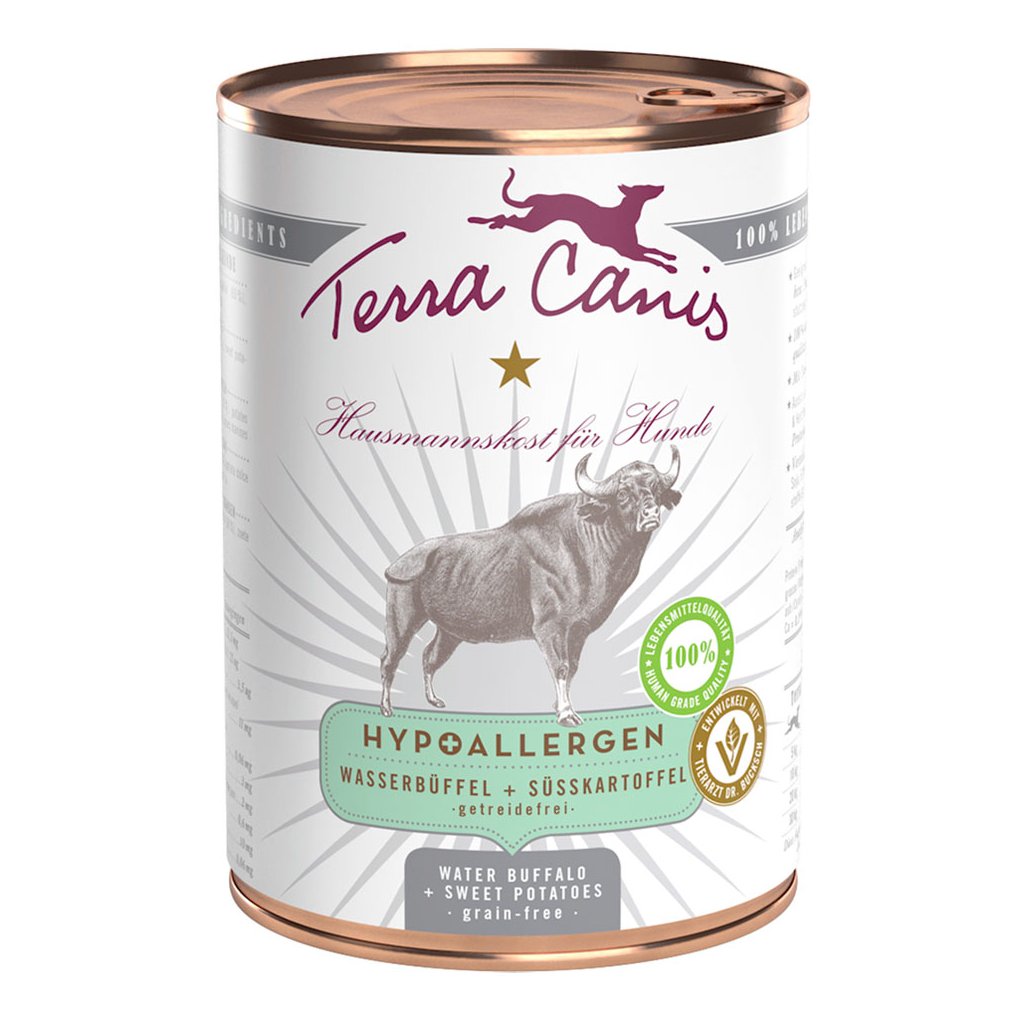 Hypoalergenní konzervy Terra Canis obsahují 60 % čisté svaloviny jako jediný zdroj bílkovin. Maso je doplněno nízkoalergenní zeleninou. Lněný olej poskytuje vysoce kvalitní omega-3 mastné kyseliny a je známo, že podporuje gastrointestinální trakt a má pozitivní vliv na kůži a srst. Vyvážená směs vitamínů a minerálů zajišťuje, že je pes zásoben všemi nezbytnými vitamíny, minerály a stopovými prvky.