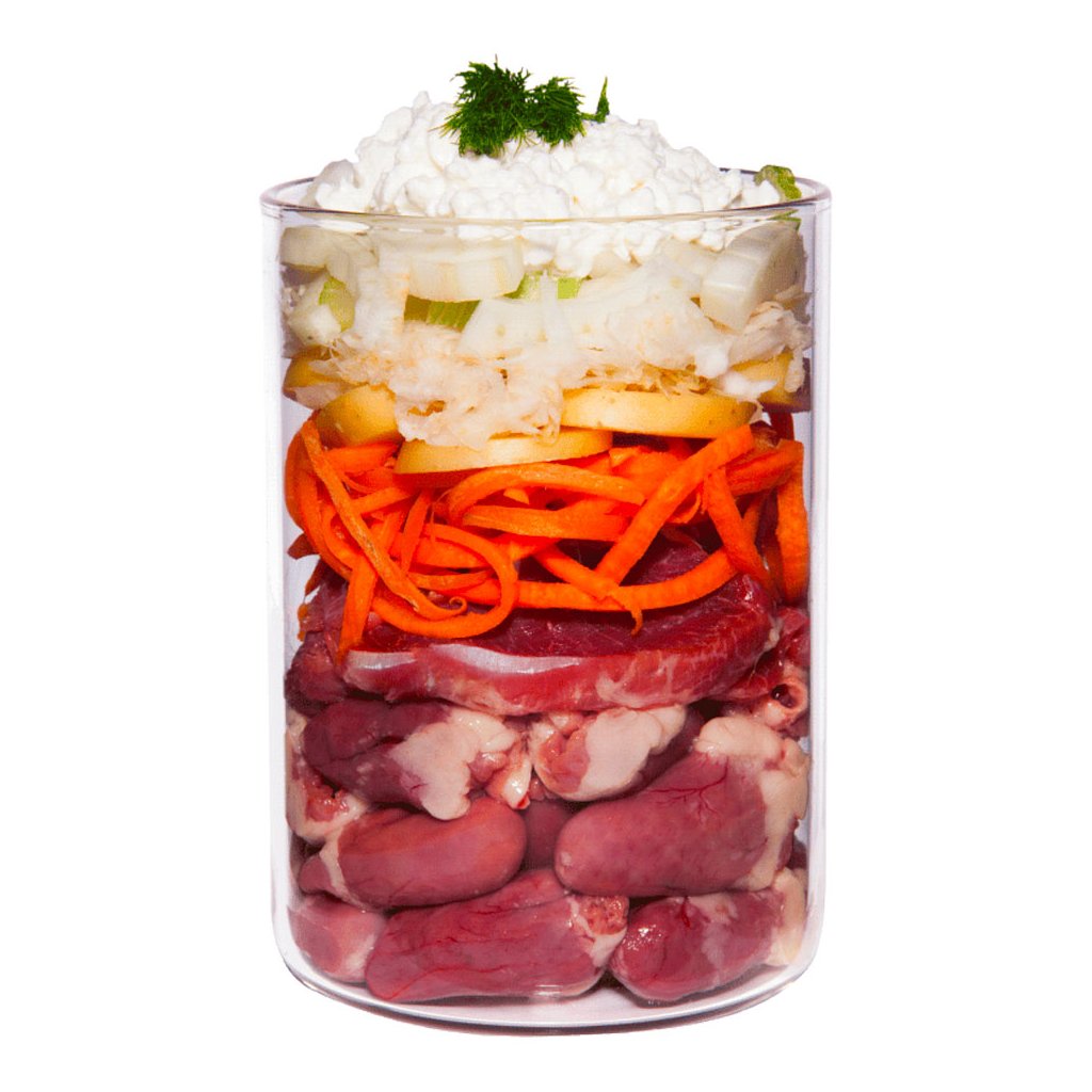 Kuřecí srdce 38 %, kuřecí žaludek 19 %, mrkev 14 %, brambory 9 %, fenykl 8 %, celer 4 %, tvaroh 3 %, kokosová mouka 1 %, skořápky ústřice*, minerální jíl* 0,5 %, heřmánek* 0,5 %, měsíček* 0,3 %, andská sůl 0,2 %, olej z černého kmínu 0,2 % , mořské řasy*, minerální látky.