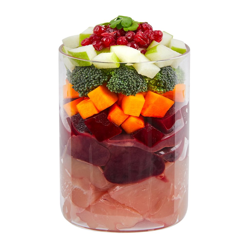 Dýně, červená řepa, římský salát salát a brokolice v kombinaci s jablky a jahodami vytvářejí pestrou směs ovoce a zeleniny, která zajistí, že pes bude mít v misce dostatek vitamínů, minerálů a fytochemikálií (vysoce aktivní látky, které mají schopnost modulovat metabolismus a zvýšit obranyschopnost).