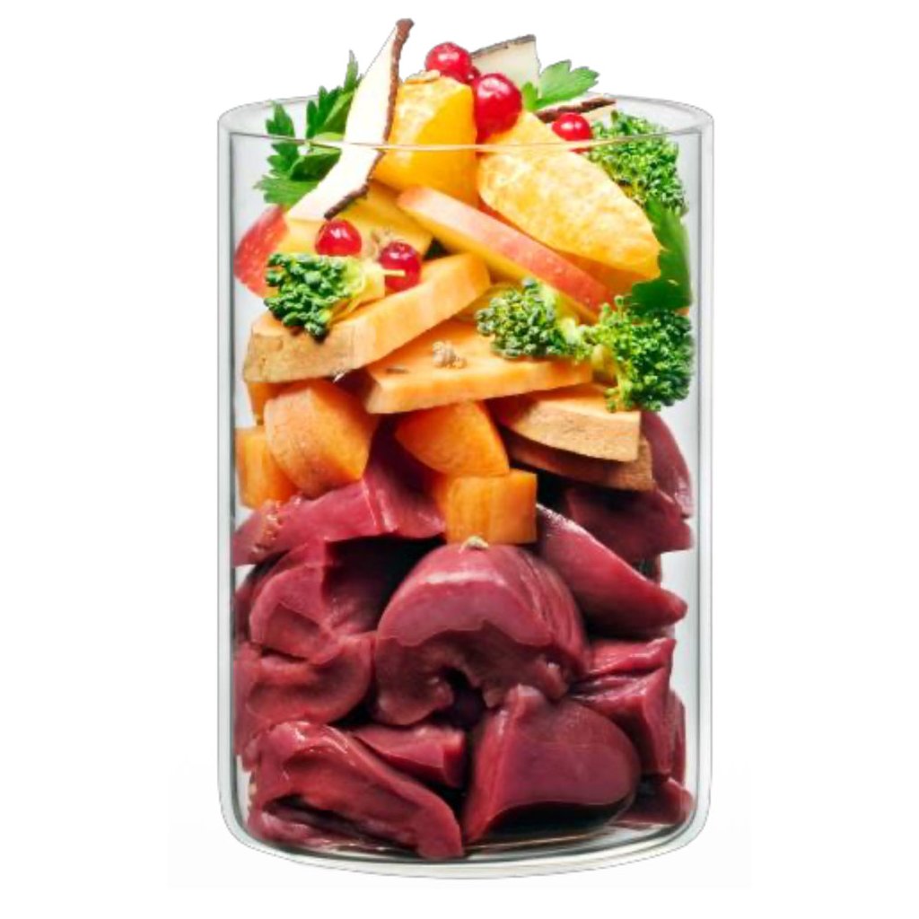 Husí srdce 48 %, vývar 22 %, brambory 5 %, mrkev 5 %, sladké brambory 5 %, brokolice 4 %, červená řepa 4 %, jablka 2 %, mandarinky 1 %, kokosová mouka 1 % *, brusinky 1 %, sladké kaštany, řepkový olej, kokosové vločky 1 % *, ústřicové skořápky *, rozmarýn *, petržel *, kardamom *, anýz *, šípková slupka *.