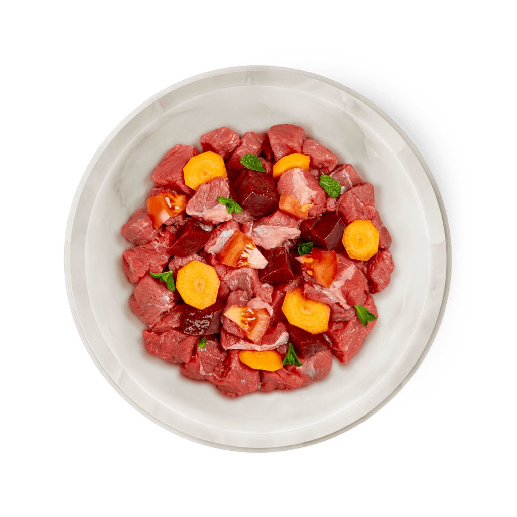 Hovězí maso ze srdeční svaloviny 58 %, hovězí plíce 14 %, hovězí játra 14 %, hovězí svalovina 4 %, mrkev 4 %, rajčatový prášek, řepkový olej, šanta kočičí*, minerální látky.