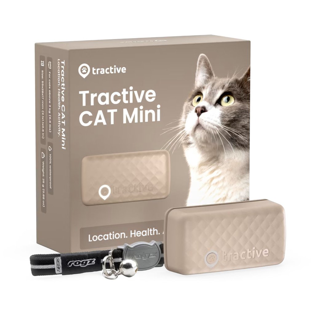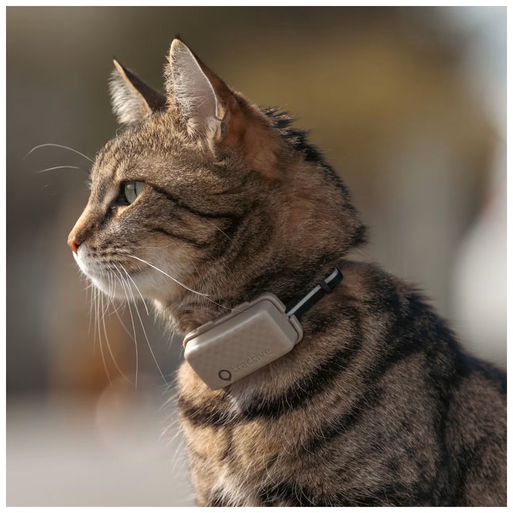 Tractive GPS CAT Mini. Zařízení sleduje aktuální polohu a aktivitu zvířete a přenáší je do mobilního telefonu a počítače. Kompatibilní s iPhone, Android, Apple Watch a Alexa.
