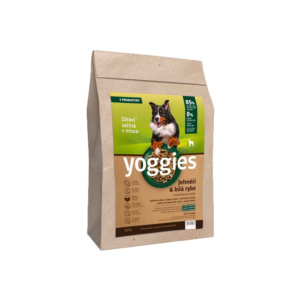 Granule lisované za studena Yoggies s jehněčím masem a bílou rybou jsou novým trendem ve zdravém krmení psů. Jsou bez obilí, sóji, lepku i chemie, zato obsahují spoustu jehněčího masa a bílé ryby. Díky unikátnímu procesu výroby si zachovávají přírodní obsah živin, a tím napodobují potravu psa z přírody. Granule jsou vyrobeny z 85% syrového masa (před pomalým sušením) a obsahují také probiotika i prebiotika, Omega 3 i 6, a tím posilují imunitní systém psa. Granule Yoggies v žaludku nebobtnají a jsou skvěle stravitelné. K výrobě je použito výhradně kvalitních, syrových mas (žádný odpad), ovoce, zeleniny i výtažku z masa mušle Perna canaliculus pro podporu šlach, vazů a kloubů. Suroviny jsou mlety nahrubo. To podporuje peristaltiku střev a čistí trávicí trakt od usazenin a různých parazitů.