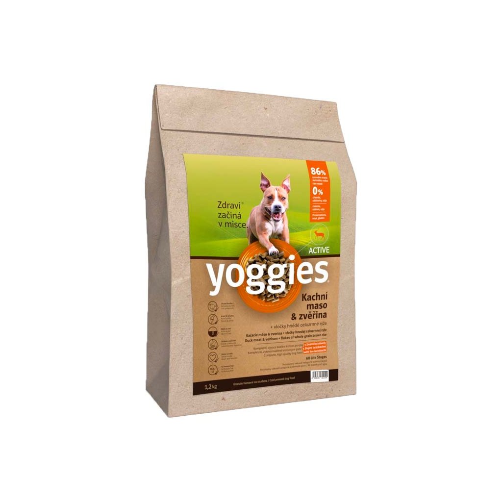 Novým trendem ve zdravém a vysoce výživném krmení psů jsou granule lisované za studena bez obilí, sóji i chemie ze skutečného kachního a jeleního masa. Obsahují 28,6 % skutečných živočišných bílkovin a 12 % tuků přímo z masa. Díky unikátnímu procesu výroby si zachovávají přírodní obsah živin a tím napodobují potravu psa z přírody. Granule jsou vyrobeny z 86 % syrového masa (před pomalým sušením) a obsahují také probiotika i prebiotika čímž posilují imunitní systém psa. Granule Yoggies v žaludku nebobtnají. K výrobě je použito výhradně kvalitních, syrových mas (žádný odpad), ovoce, zeleniny i surovin pro podporu šlach, vazů a kloubů. Suroviny jsou mlety nahrubo. To podporuje peristaltiku střev a čistí trávicí trakt od usazenin a různých parazitů.