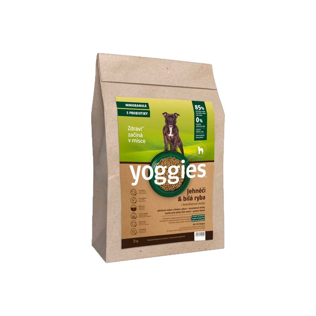 Granule lisované za studena Yoggies s jehněčím masem a bílou rybou jsou novým trendem ve zdravém krmení psů. Jsou bez obilí, sóji, lepku i chemie, zato obsahují spoustu jehněčího masa a bílé ryby. Díky unikátnímu procesu výroby si zachovávají přírodní obsah živin, a tím napodobují potravu psa z přírody. Granule jsou vyrobeny z 85% syrového masa (před pomalým sušením) a obsahují také probiotika i prebiotika, Omega 3 i 6, a tím posilují imunitní systém psa. Granule Yoggies v žaludku nebobtnají a jsou skvěle stravitelné. K výrobě je použito výhradně kvalitních, syrových mas (žádný odpad), ovoce, zeleniny i výtažku z masa mušle Perna canaliculus pro podporu šlach, vazů a kloubů. Suroviny jsou mlety nahrubo. To podporuje peristaltiku střev a čistí trávicí trakt od usazenin a různých parazitů.