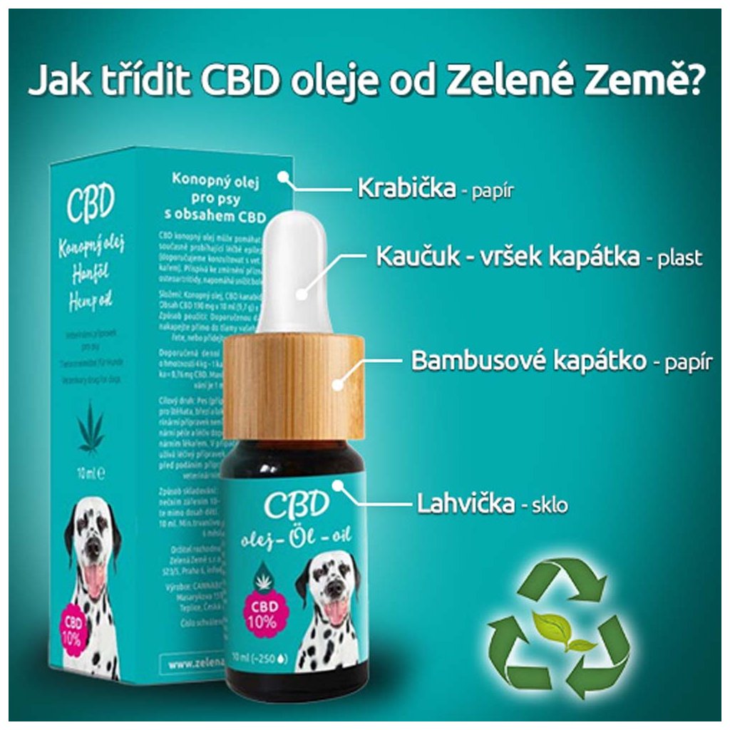 CBD olej pro psy. Doplněk stravy pro psy. Vyrobeno v České republice.CBD olej od české značky Zelená Země. Doporučujeme při kloubních problémech, bolestech a artritidě. Pomáhá taky při stresu a úzkosti. Výborně se osvědčuje při epilepsii, cukrovce a jako podpora pro lepší trávení a posílení imunitního systému. Doporučujeme také při pooperačních stavech, nádorových onemocněních a na kožní vyrážky.